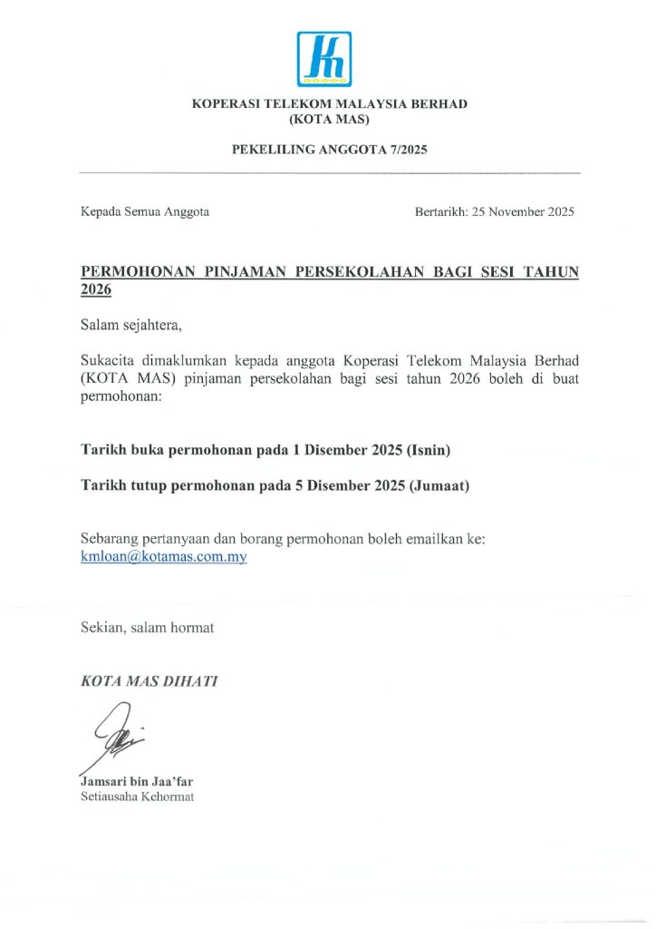 PEKELILING ANGGOTA 7/2025 PERMOHONAN PINJAMAN PERSEKOLAHAN BAGI TAHUN 2026